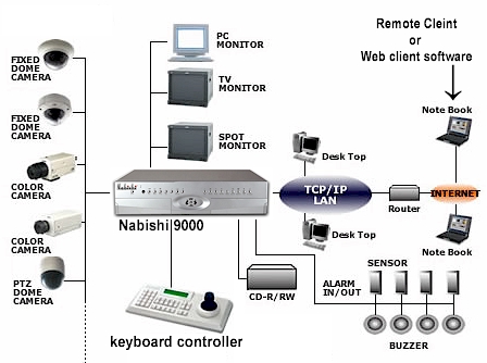A kerítésmenti õrzóna, a létesítmény belsõ területei, az épületek bejáratai, folyosói és egyes helyiségei megfigyelését zártláncú televíziós hálózat biztosítja. A televíziós rendszer a helyszíneken történõ események központi figyelemmel kisérésére és különféle jelzõberendezések riasztása esetén a jelzés körülményeinek azonnali felmérésére szolgál. A kamerák CCD típusok, kültéren védettházas kivitelûek. A felvevõelem mérete 1/2", illetve 1/3". A videorendszer a 220V/50 Hz-es hálózatról mûködik. A kamerák hálózatra szinkronizáltak. Az alkalmazott objektívek autó vagy manuál írisszel rendelkeznek. Az objektívek látószöge a feladatnak megfelelõ, széles skálából választható. A televíziós rendszert a számítógép vezérli. Riasztás esetén a számítógép automatikusan monitorra kapcsolja annak a kamerának a televíziós képét, amellyel az adott terület kamerával megfigyelhetõ. Áthatoláskor, az érzékelõk riasztása esetén a terület televíziós képét a rendszer automatikusan DVR-re rögzíti. | |||||||||||||||||||||||||||||||||||||||||||||||||||||||||||